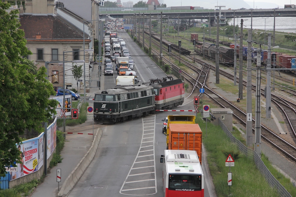 Diesmal konnten wir auch erstmals von der Station Praterkai aus unten ein paar BÜ-Fahrten sehen. Stellvertretend dafür möchte ich das Bild von 1144 282 mit 2143 040 zeigen. Aufgenommen am 17.05.2013.