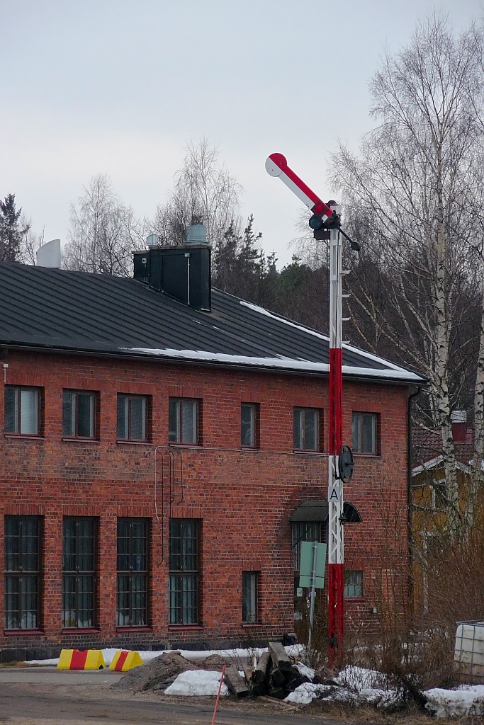 Ein altes Formsignal ist im BW des Bahnhofs Riihimäki ausgestellt, 12.4.13