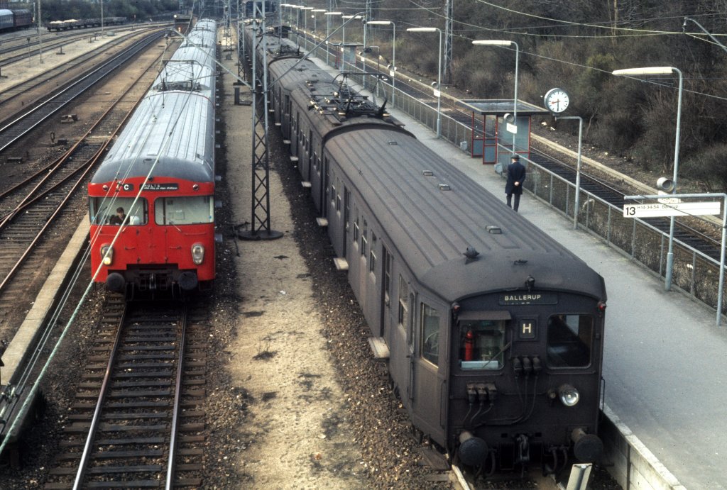 København / Kopenhagen im Februar 1975: DSB S-Bahn Linie C erreicht in Kürze den Bahnhof Østerport, während ein Zug der ersten Generation auf der Linie H am Gleis 13 hält.