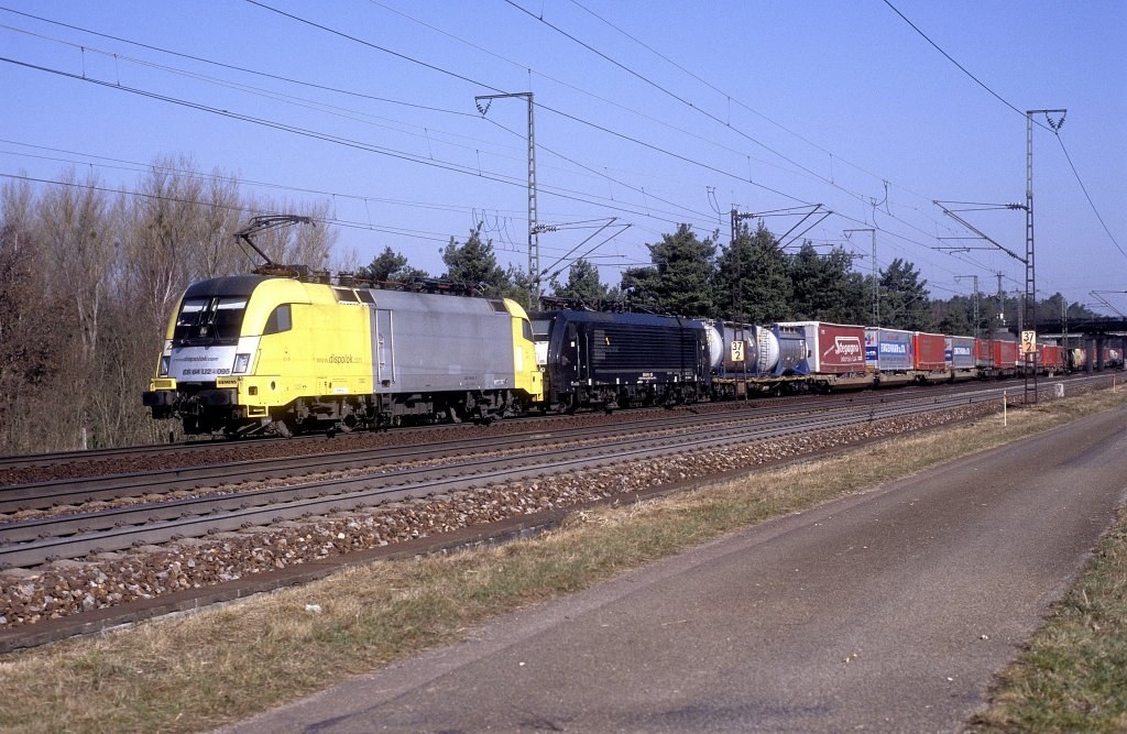 185 607 wurde am 28.1.13 von SBB Cargo/RTB 482 047 durch Ratingen-Lintorf geschleppt.