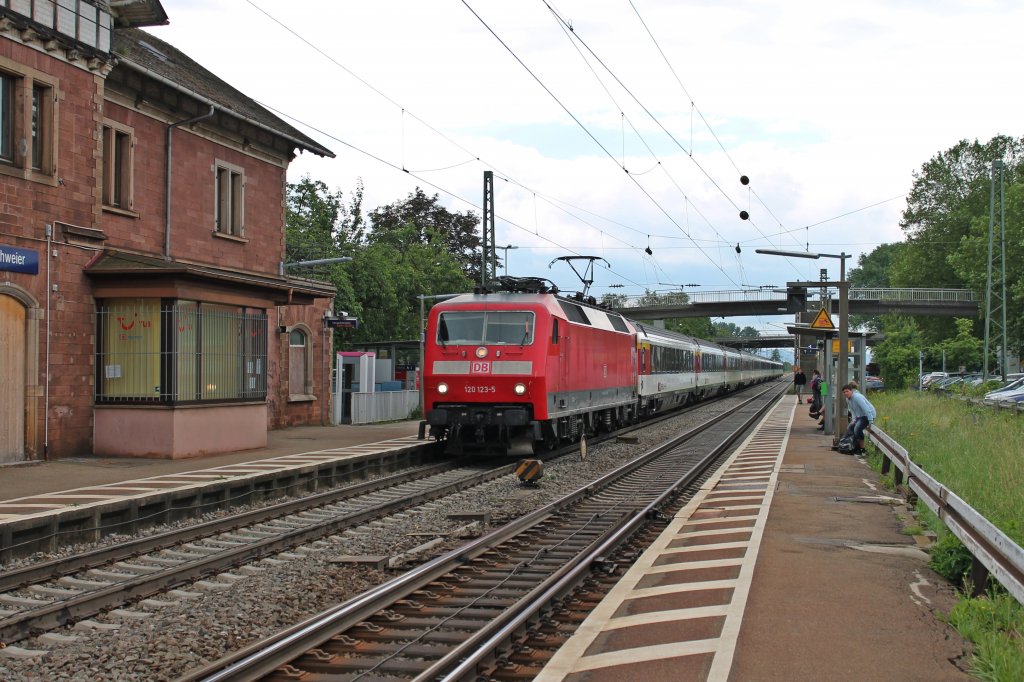 Am 25.06.2013 war wieder mal eine außerplanmäßige 120er am EC 8 als Ersatz für eine 101er. An diesem Tag war es 120 123-5 bei der Durchfahrt gen Norden in Orschweier.