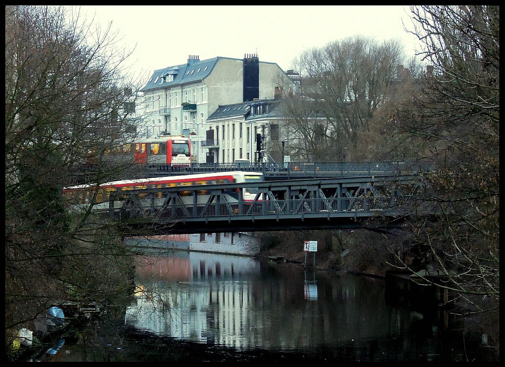 Archiv: Blick über den Isebekkanal auf die Hamburger U-Bahnstation "Eppendorfer Baum" der Linie U3. Im Vordergrund kommt ein Zug der Linie U1 aus dem Tunnel von der Station "Klosterstern". 31.12.2011