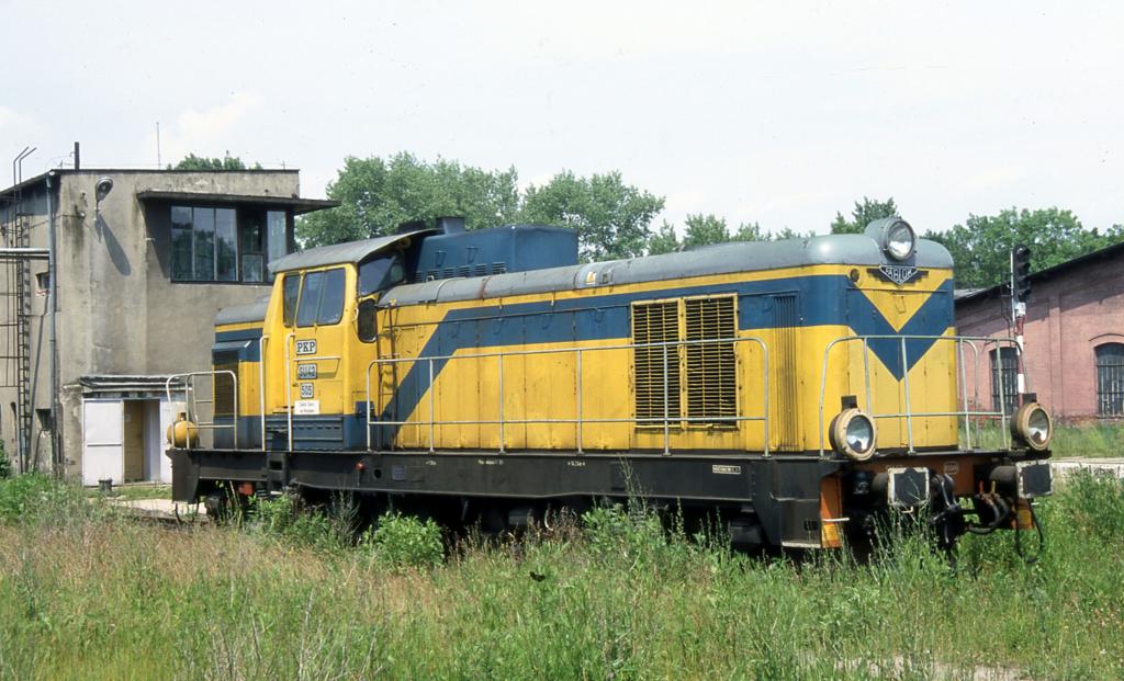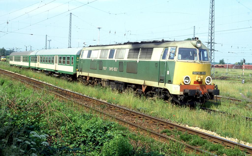 SU 45 052 steht hier mit polnischen Nahverkehrswagen am 14.6.2001 am Rand des Bahnhofs auf einem Abstellgleis.