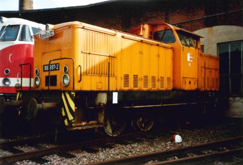 Aufbereitung einer Lok. Hier zusehen 106 897-2 am ...10.06 in Chemnitz-Hilbersdorf beim sächsischen Eisenbahnmuseum. Foto ist eingescannt!