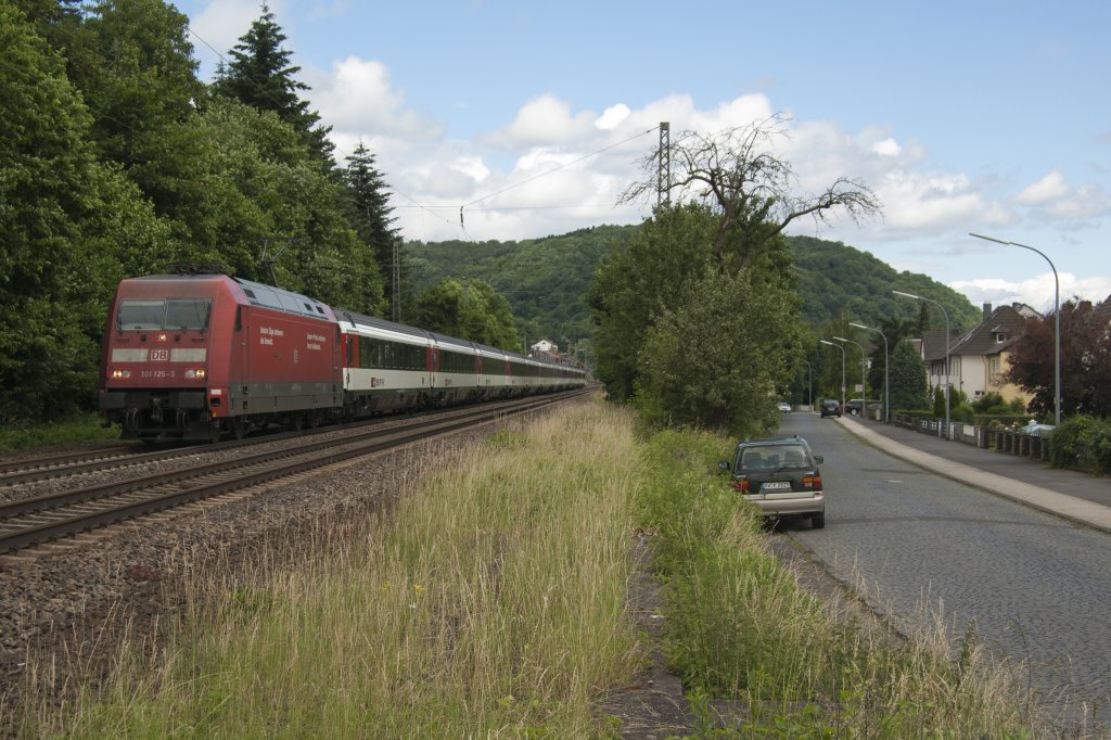 DB 101 125 mit EuroCity 9 von Dortmund nach Chur passiert die Fotograf bei Oberwinter.