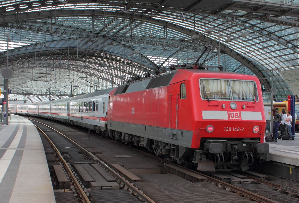 Die 120 148-2 als Schublok für den IC 140 von Berlin Ostbahnhof nach Amsterdam Centraal am 16.06.2013 in Berlin Hbf.