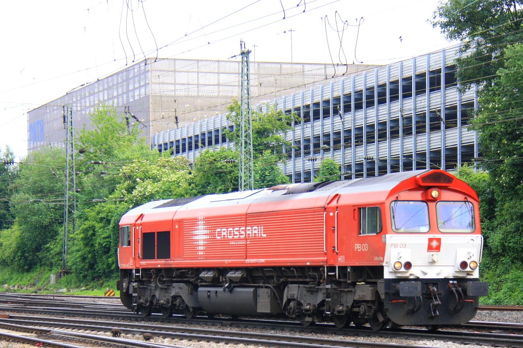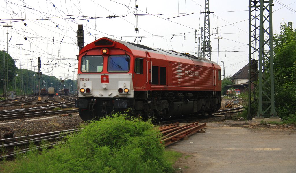 Die Class 66 PB03 "Mireille" von Crossrail rangiert in Aachen-West und im Hintergrund steht auf dem abstellgleis in Aachen-West bei Sonne und Wolken am Abend vom 11.6.2013.