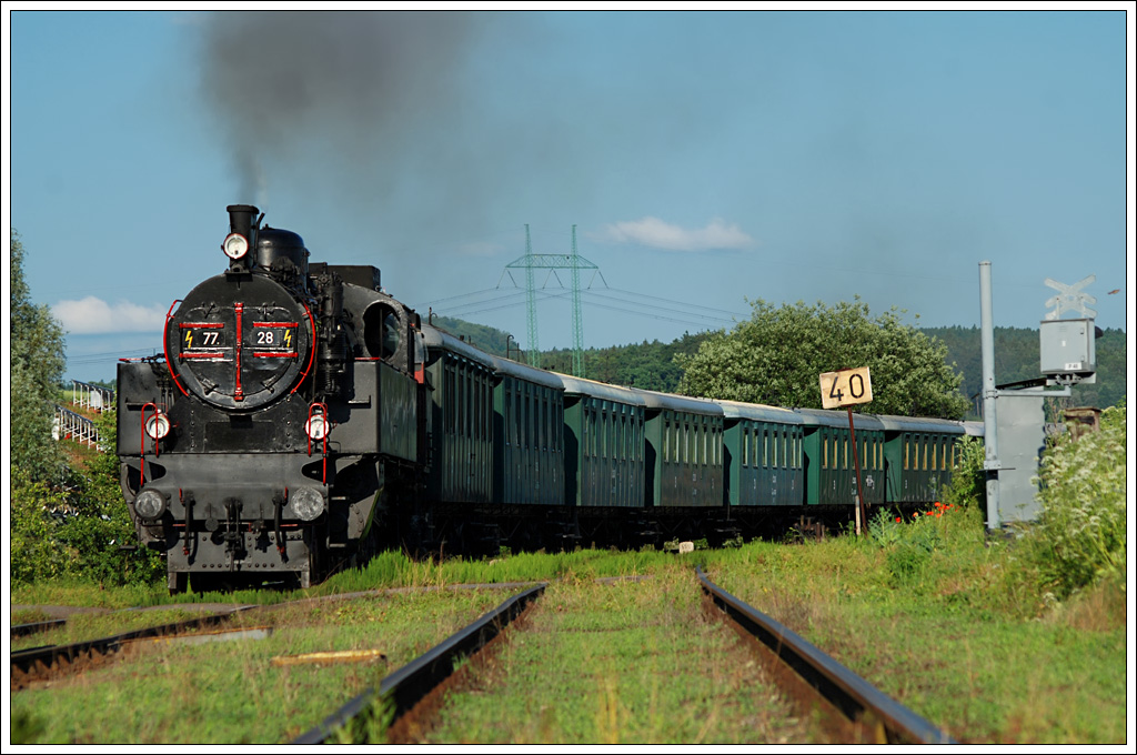 ÖGEG 77.28 (ex BBÖ 629.43) bei der Einfahrt in Krupá (CZ) am 21.6.2013 anlässlich des k&k Dampfloktreffens im Eisenbahnmuseum Lu¸ná u Rakovníka (CZ). Um Diskussionen zu vermeiden – hier handelt es sich um einen organisierten Fotozug, bei dem u.a. auch bei dieser Aufnahme das zweite Gleis als Fotostandpunkt diente.