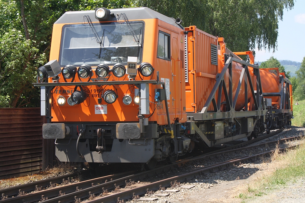 Tersus X691.503-7 (UIC-Nr. 99 81 9195 504-1), ein Umbau aus DB-Cargo Sprinter und Bestandteil des MMT (Multi Modul Train), fährt am 21.Juni 2013 von Fohnsdorf nach Zeltweg.