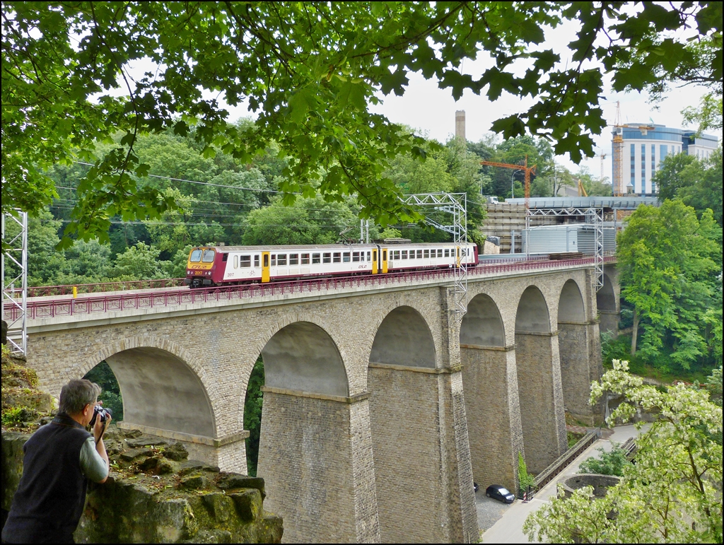 . Interessante Fotostelle - Das Plateau du Rham (op der Rumm) in Luxemburg Stadt bietet den Fotografen eine gute Sicht auf den Pulvermühle Viadukt (Bisser Bréck) und so kann der Triebzug Z 2017 auf der schönen Brücke abgelichtet werden. 14.06.2013 (Jeanny)