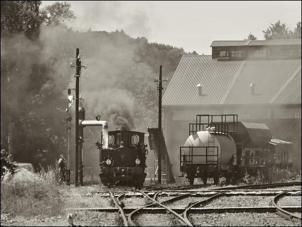 . Wasserfassen in Fond de Gras - Die Temperaturen am 16.06.2013 machten nicht die Fotografen durstig, auch die Dampflok N° 8 (ADI 8) der Museumsbahn “Train 1900” profitierte von dem Aufenthalt im Bahnhof von Fond de Gras, um ihren Durst zu stillen. (Hans) Die Lok N° 8 (ADI 8) aus dem Jahr 1900 war die erste Dampflok, die 1973 zur Museumsbahn kam und sie ist somit auch die Namensgeberin der Museumsbahn. Sie gehörte vorher der Hütte HADIR Differdange und verrichtete bis 2007 unermüdlich ihren Dienst bei der Museumsbahn. Dann überliess sie anderen Dampfloks die Aufgabe die Züge des Train 1900 zu ziehen. Bei einer Kontrolle des Kessels, wurde festgestellt, dass dessen Zustand im Grunde noch nicht so schlecht war und es wurde beschlossen, die schöne kleine Lok wieder aufzuarbeiten und erneut betriebsfähig zu machen. Nach 5 Jahren Arbeit drehte sie 2012 wieder ihre ersten Runden in Fond de Gras. Sie bekam ausserdem das original Farbkleid zurück, welches sie bei der HADIR in Differdange getragen hatte. Zur Vervollständigung hier noch die technischen Daten der Lok: Hersteller: Hannoversche Maschinenfabrik - Georg Egestroff (spätere HANOMAG) Fabriknummer: 3431 Baujahr: 1900 Typ: (020 T) B2nt Herkunft: ARBED (ex HADIR) Differdange