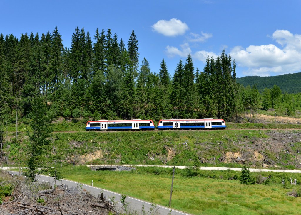650 563 (VT 63) + 650 565 (VT 65) als RB nach Zwiesel am 21.06.2013 bei Frauenau.