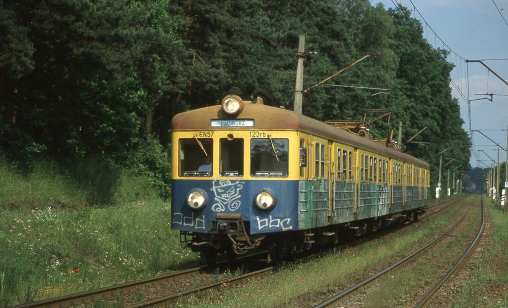 Im Nahverkehr zwischen Rybnik und Oppeln verkehrte am 15.06.2001 der EN 57-123. Bei Szymocice ist er hier in Richtung Oppeln unterwegs.