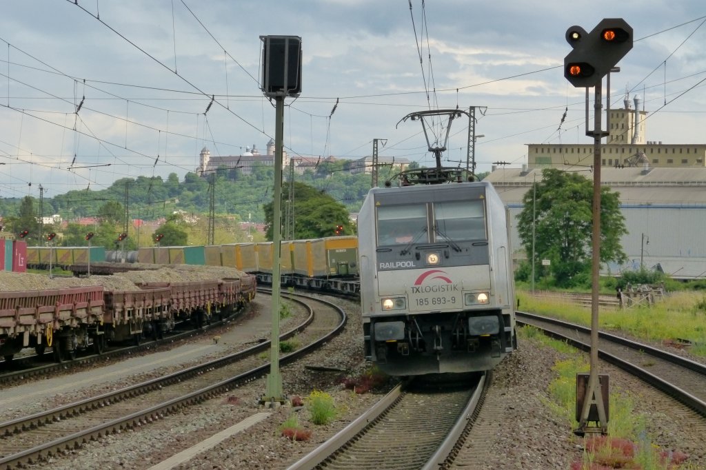 TXL 185 693 am 24.6.13 mit einem Güterzug richtung Gemünden in Würzburg-Zell.