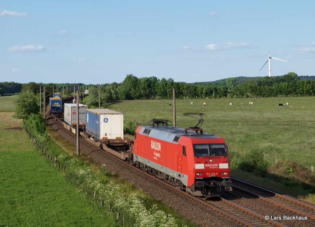 152 128-5 hat am 05.06.13 den KT 50275 Lübeck-Skandinavienkai - Basel am Haken und passiert Ramelsloh Richtung Bremen.