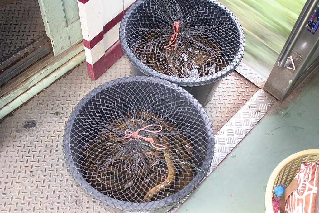 Einige der Fahrgäste im บชส. 484 (บชส. =BTC./Bogie Third Class Carriage), aufgenommen am 17.Mai 2013 während der Fahrt mit dem ORD 446 zwischen den Bahnhöfen Ban Duat und La Mae.