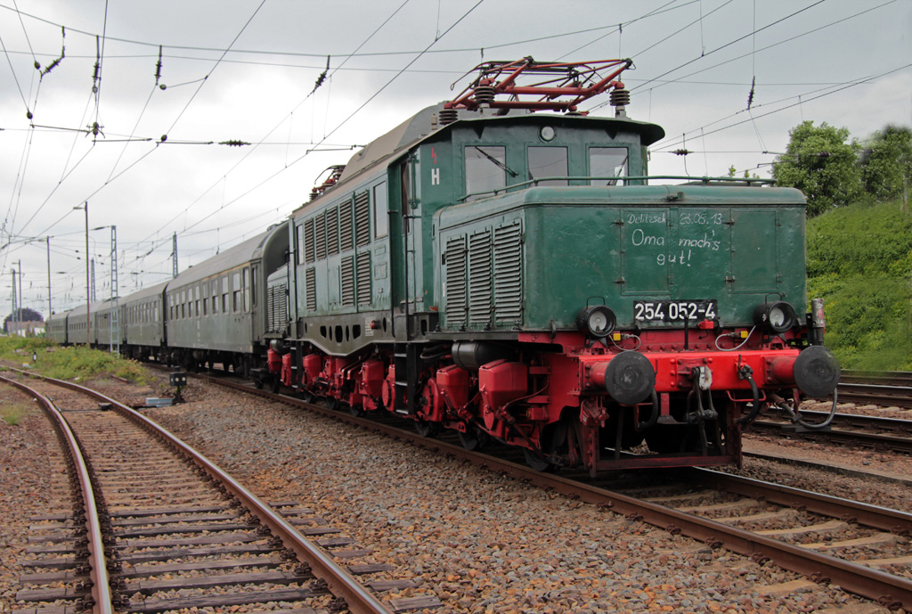 Mit der Aufschrift  Oma mach's gut  verließ  254 052-4 am 24.Mai 2013 von Delitzsch aus ihre Heimat und ihr altes Einsatzgebiet. Wieder eine weg.