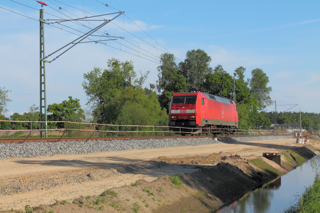 Offensichtlich wird der Streckenneubau getestet. Seit zwei Tagen pendelt die 152 029-5 zwischen Neustrelitz und Oranienburg, so in Nassenheide am 06.06.2013. Am 09.06.2013 soll die Strecke wieder eingleisig in Betrieb gehen.