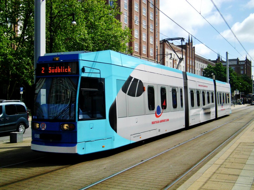 Rostock: Straßenbahnlinie 6 nach Rostock-Südstadt Mensa an der Haltestelle Rostock-Altstadt Lange Straße.(3.6.2013)