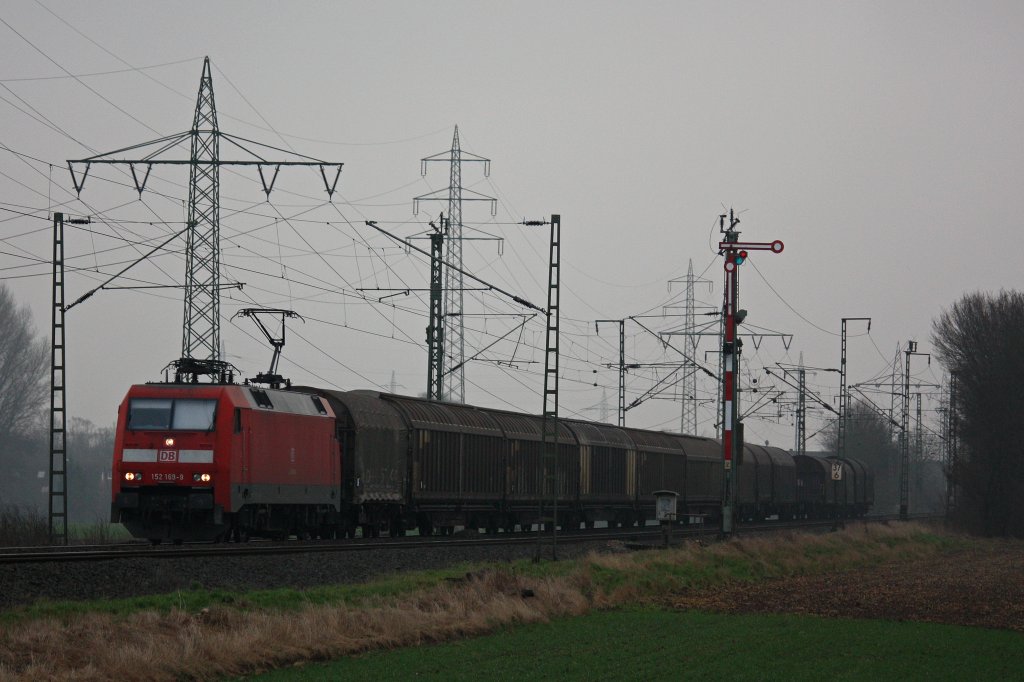 152 169 am 6.1.13 mit einem gemischten Güterzug in Neuss-Weißenberg.