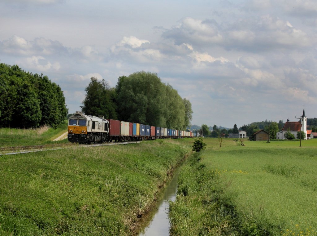 Die 761 002 mit einem Containerzug am 07.06.2013 bei der Ausfahrt aus Tüßling.