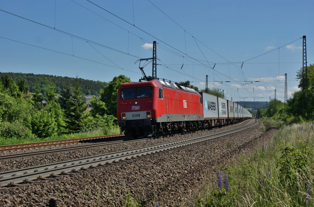 Die MEG 803 (156 003)am 06.06.2013 mit Seecontainer vor Fulda.