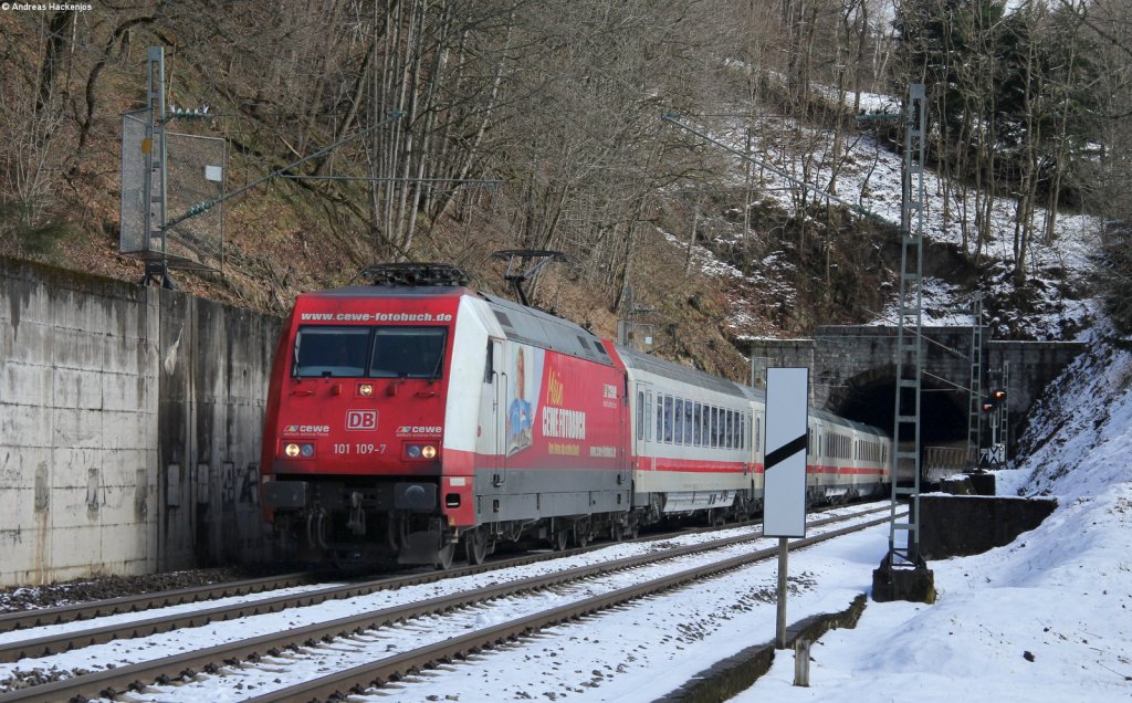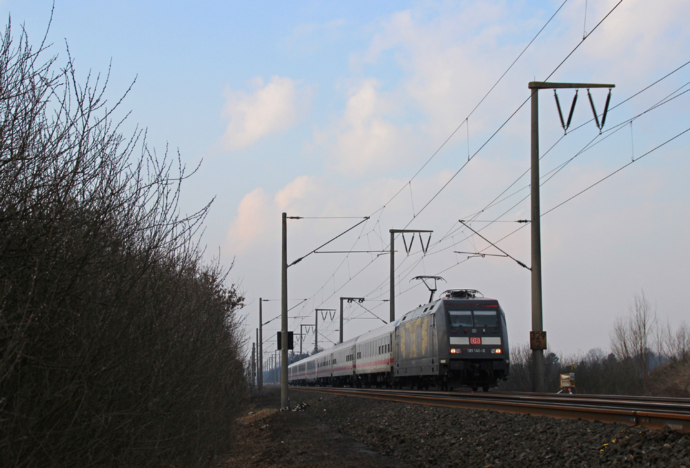 101 141-0 fuhr am 18.03.2013 mit dem IC 2332 von Norddeich nach Köln, hier bei Veenhusen.