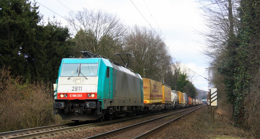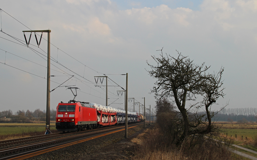 185 171-6 fuhr am 18.03.2013 mit einem gemischten Güterzug von Osnabrück nach Emden, hier bei Veenhusen.