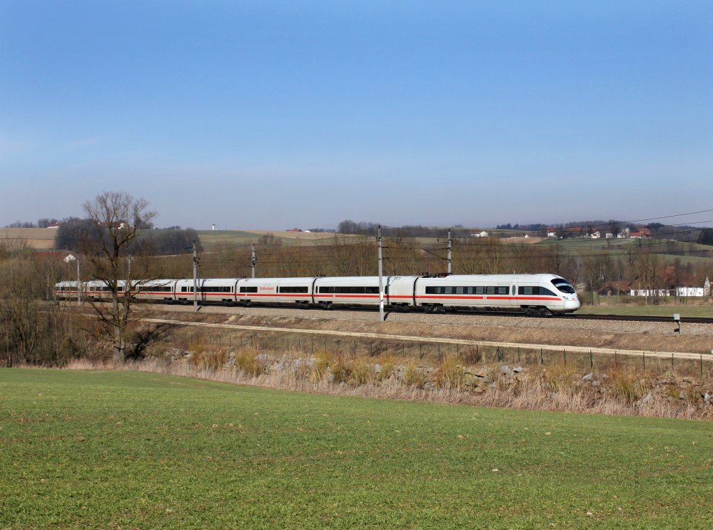Zwei ICE in Rotenburg (Wümme). Der eine fährt in Richtung Hamburg, der andere in Richtung Bremen. Aufgenommen am 5.3.2013.