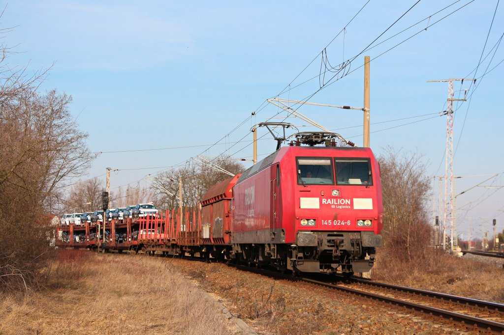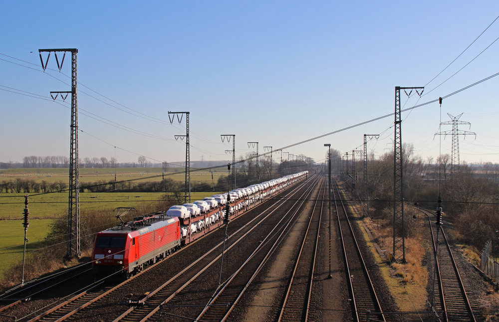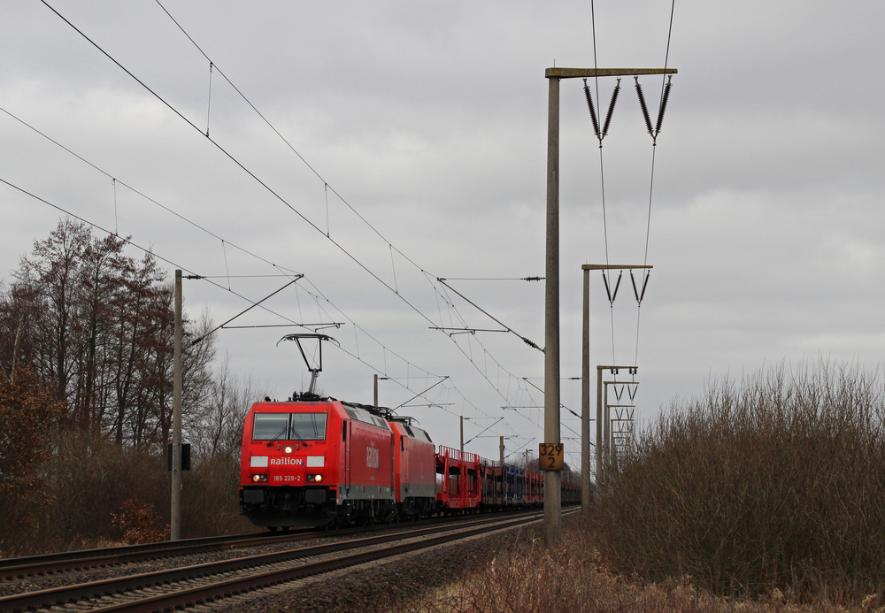 185 229-2 fuhr am 02.03.2013 mit einer 152 im Schlepp und einem leeren Autozug von Emden nach Osnabrück, hier bei Veenhusen.