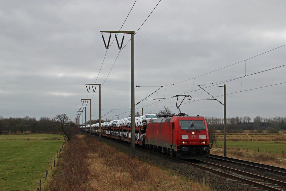 185 385-2 fuhr am 02.03.2013 mit einem Autozug von Osnabrück nach Emden, hier bei Veenhusen.