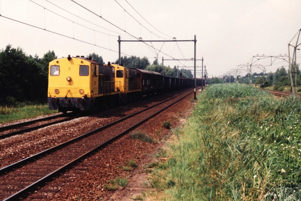 2381 und 2277 mit Güterzug 51200 Feijnoord-Kijfhoek auf Bahnhof Barendrecht am 15-7-1994. Bild und scan: Date Jan de Vries.