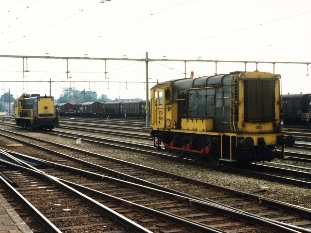 610 und 2229 auf Bahnhof Nijmegen am 10-8-1987. Bild und scan: Date Jan de Vries.