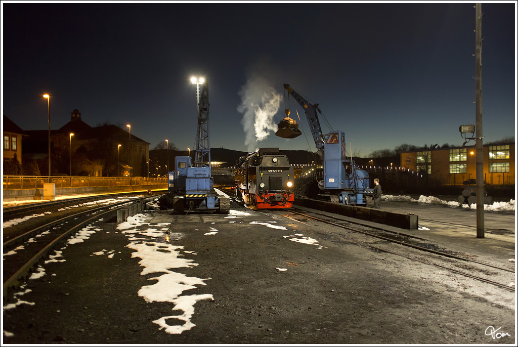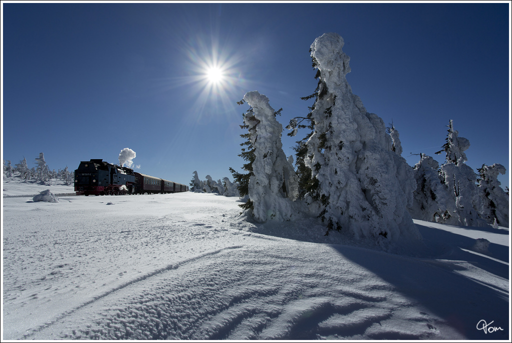 Noch ein Foto vom Brocken; hier umfährt die 99.7237 gerade den Zug, um in Kürze wieder die Talfahrt anzutreten. (04.03.2013)