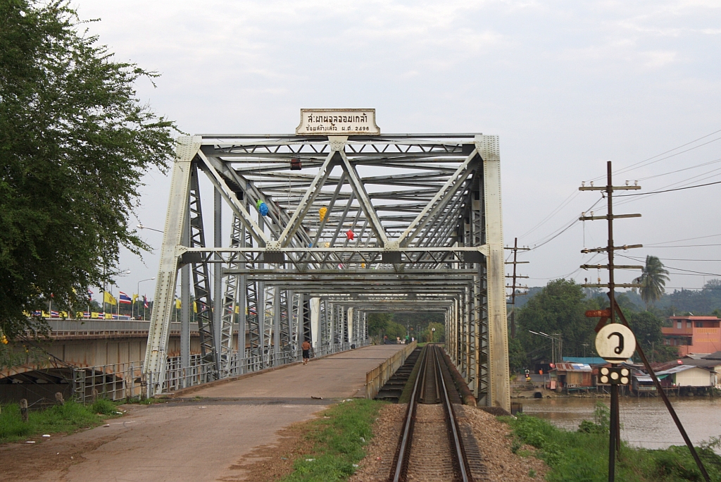 Die 1953 errichtete Chulachomklao Bridge erfüllt, wegen der später parallel gebauten mehrspurigen Schnellstrassenbrücke, neben der Verwendung als Eisenbahnbrücke nur mehr lokale Funktion. Bild vom 07.Jänner 2013.