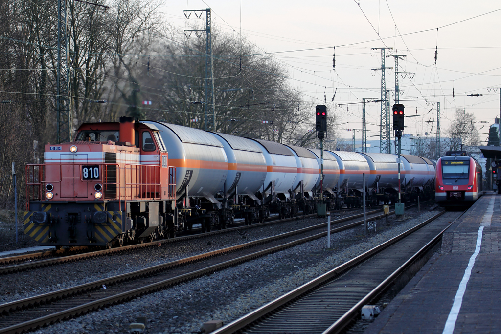 Herdorf den 07.03.2013: Links steht die Lok 42 (eine MaK 1700 BB) der KSW (Kreisbahn Siegen-Wittgenstein) mit einem Güterzug, auf dem KSW Ragierbahnhof, zur Übergabefahrt nach Betzdorf bereit. Recht über die KBS 462 (Hellertalbahn) kommt ein Stadler GTW 2/6 der Hallertalbahn GmbH und fährt gleich in den Bahnhof Betzdorf/Sieg ein.