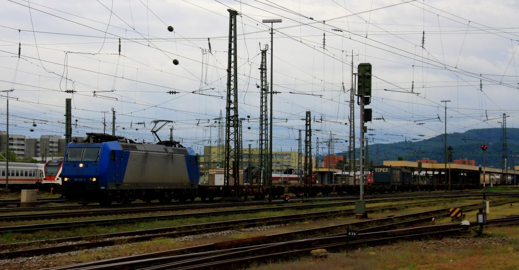 185 535-2 von Crossrail kommt durch den Badischen Bahnhof Basel(CH) mit einem langen Containerzug aus Richtung Italien und fährt in Richtung Deutschland in der Abendstimmung am Abend des 9.5.2013.