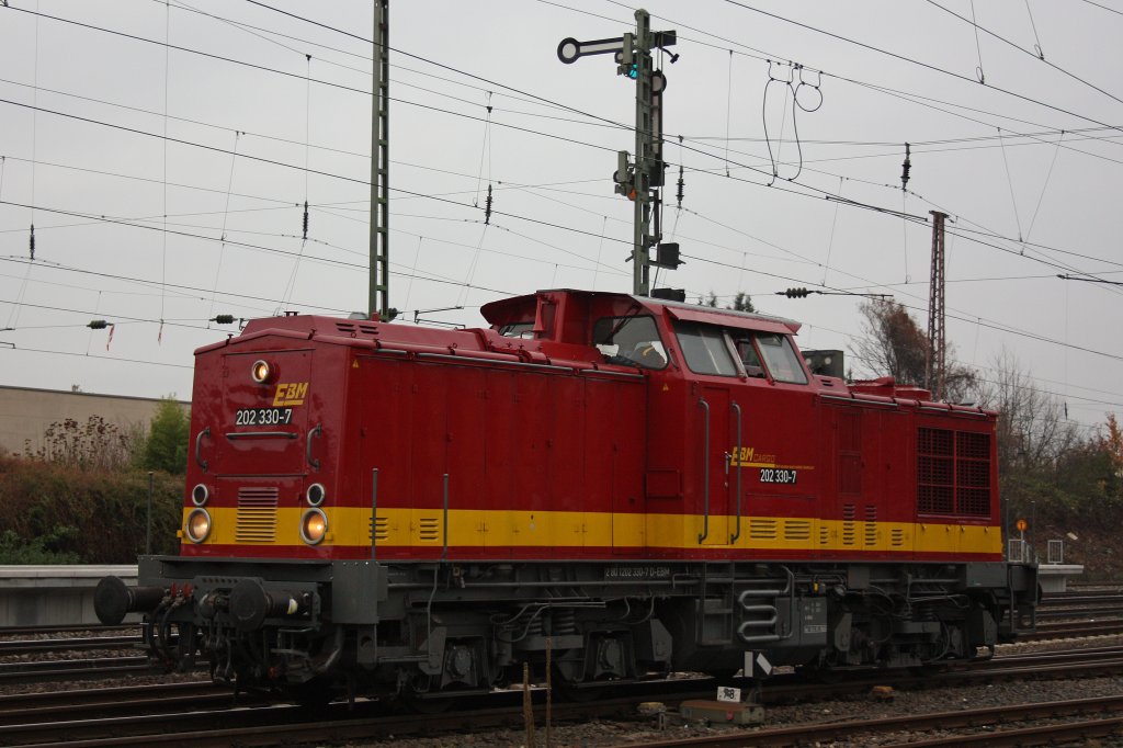 EBM Cargo 203 330 rangiert am 24.11.12 mit einem Schotterzug in Düsseldorf-Rath.