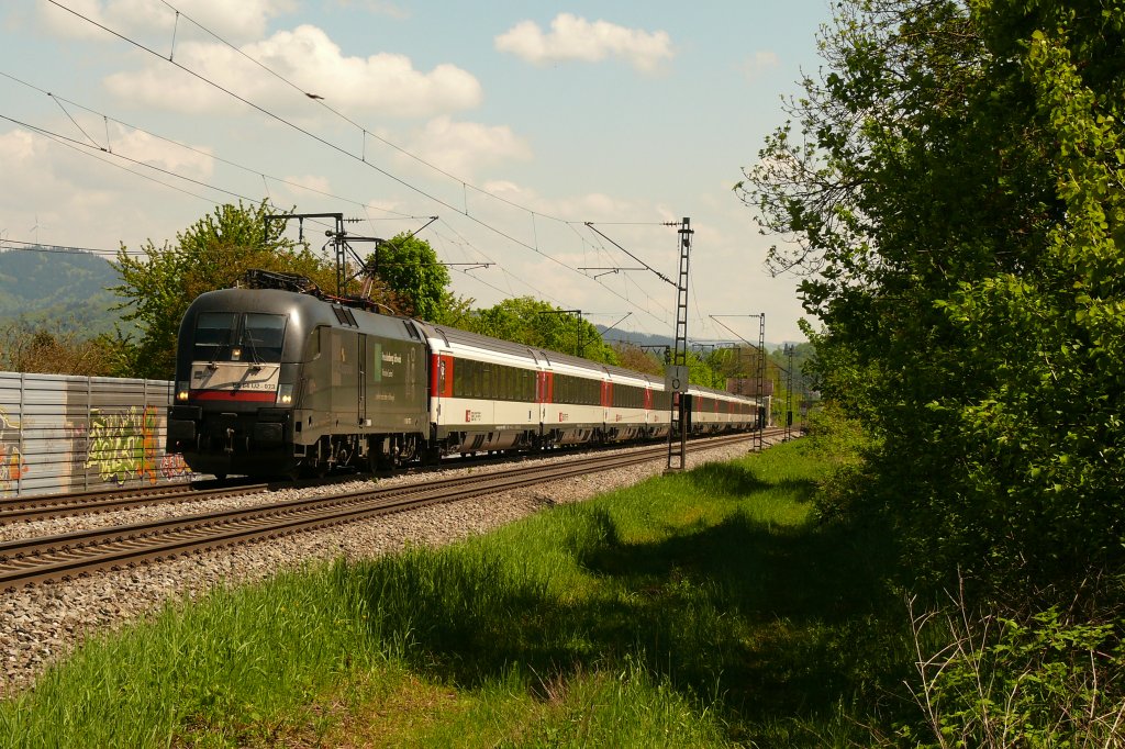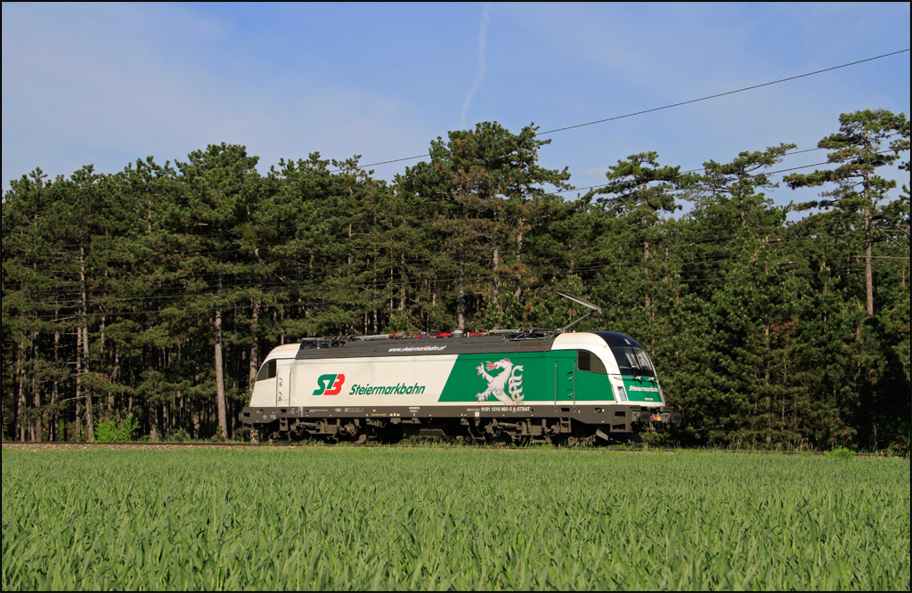 Der steirische Panther ist meiner Meinung nach das schönste Wappentier, ganz nebenbei macht er sich auch sehr gut auf Triebfahrzeugen! 1216 960 fuhr am 10. Mai 2013 als SLZ 98070 von Bruck an der Leitha nach Villach Westbahnhof, aufgenommen wurde er um 08:14 Uhr bei Unter Waltersdorf.