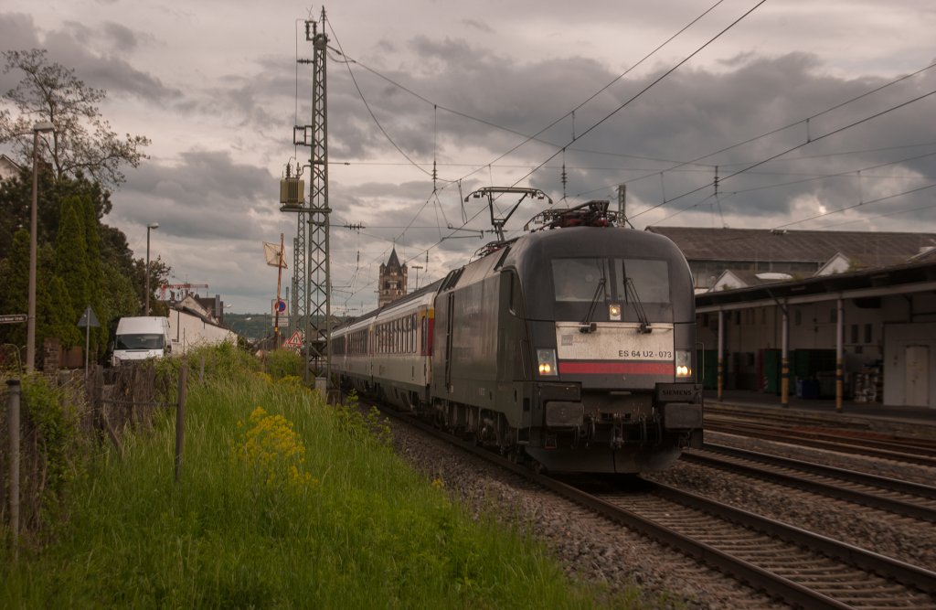 Mit hoher Geschwindigkeit durch fährt die 101 002-4 mit einem IC den Bahnhof Brohl in Richtung Koblenz am Himmelfahrtstag.9.5.2013