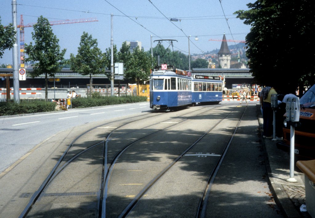 Zürich VBZ Tram 10 (Be 4/4 + B) Gessnerallee im August 1986.