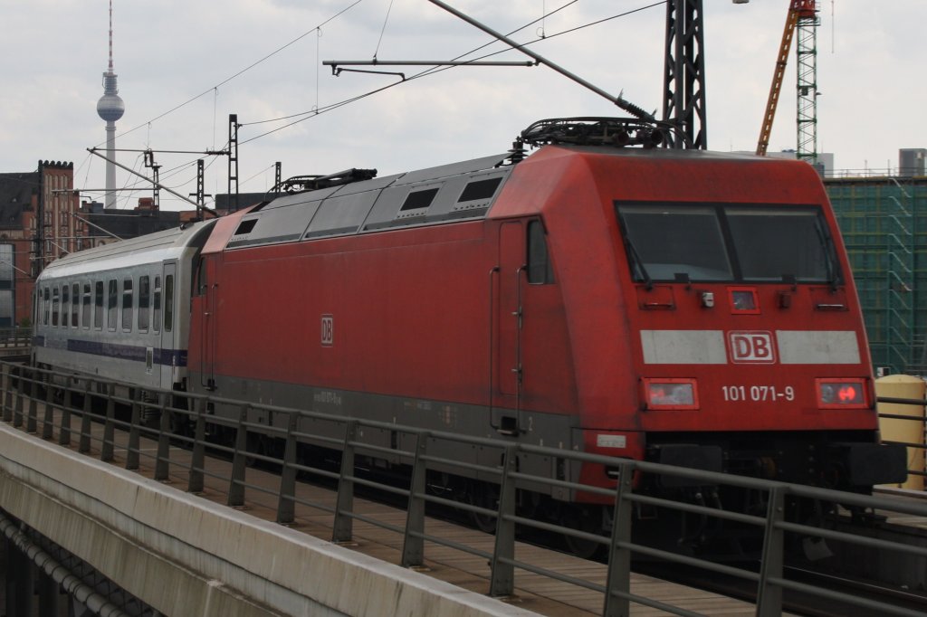 101 071-9, sie lief als Wagenlok am Leer-Reisezug, gezogen von 101 076-8 mit. Berlin Hbf., 1.5.2013.
