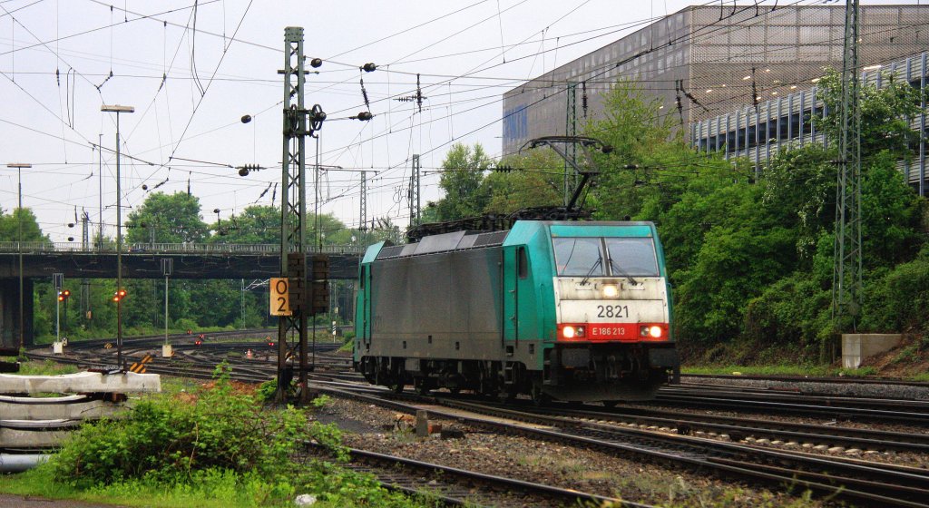 Die Cobra 2821 kommt als Lokzug aus Belgien und fährt in Aachen-West ein bei Regenstimmung am Abend des 17.5.2013.