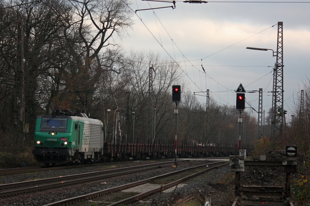 FRET 437002 am 30.11.12 mit einem Stahlzug in Ratingen-Lintorf.