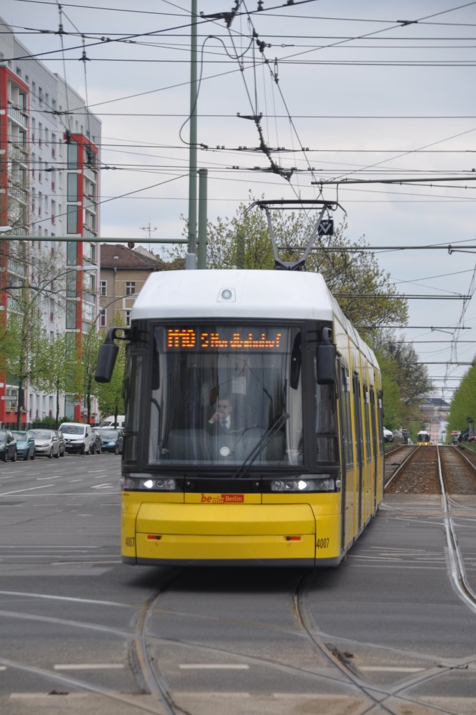 BERLIN, 01.05.2013, Wagen 4007 als MetroTram M10 nach Nordbahnhof bei der Einfahrt in die Haltestelle Landsberger Allee/Petersburger Straße