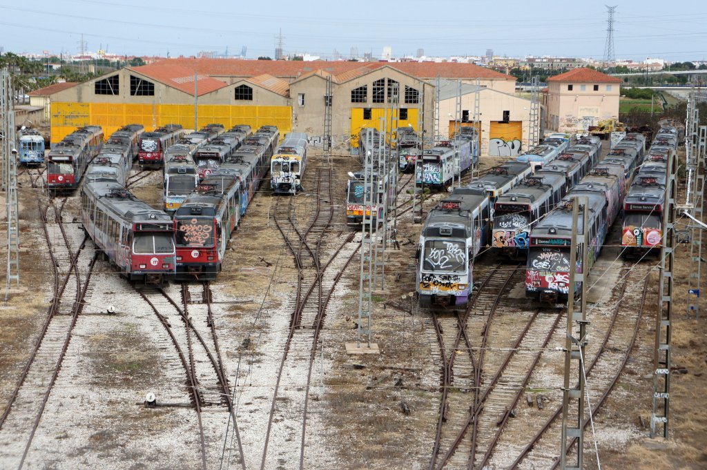 Metro / Tram Valencia: Ausgemusterte Metro-Wagen bzw. Metro- Baureihen, welche nicht mehr in Valencia verkehren. Aufgenommen im Mai 2013 in Torrent bei Valencia.