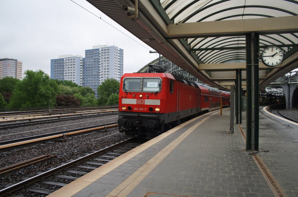 Hier 143 251-7 mit einer RB14 (RB18918) von Berlin Schönefeld Flughafen nach Nauen, bei der Ausfahrt am 18.5.2013 aus Berlin Ostbahnhof.