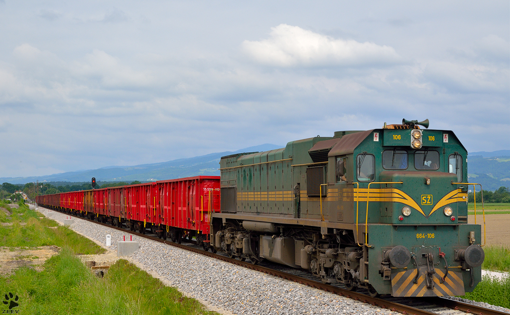 S´ 664-106 zieht Güterzug durch Gaj Richtung Hodo¨. /24.5.2013