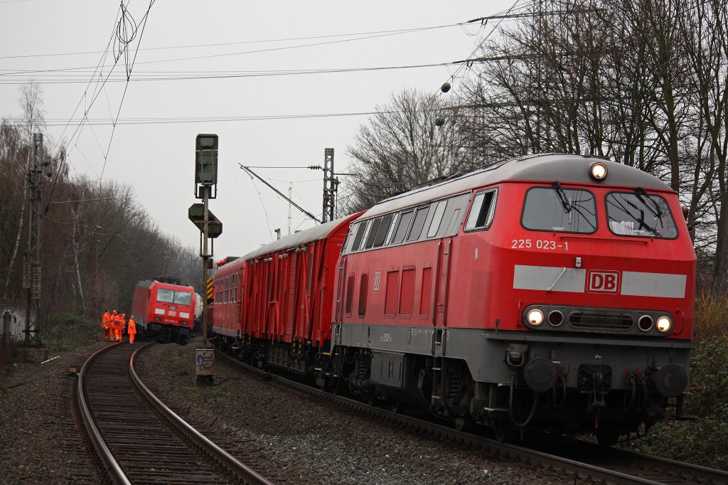 225 023 drückt am 20.12.12 ihren Hilfszug in die Unfallstelle in Düsseldorf-Eller. Der Kran gleiste später die 185 wieder auf.