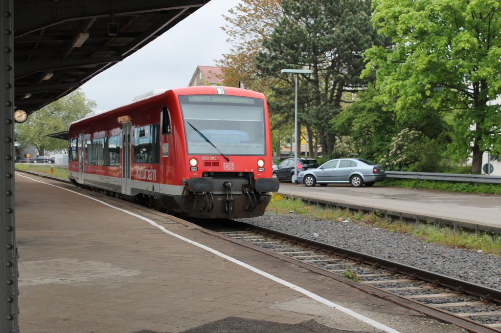 Blick über die Grenze... nach Mannenbach-Salenstein im April 2013. Der GTW der Thur(gau-)Bo(densee) erreicht in kürze den Dorfhaltepunkt.